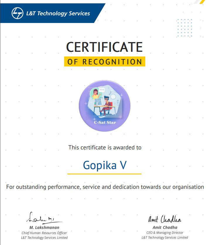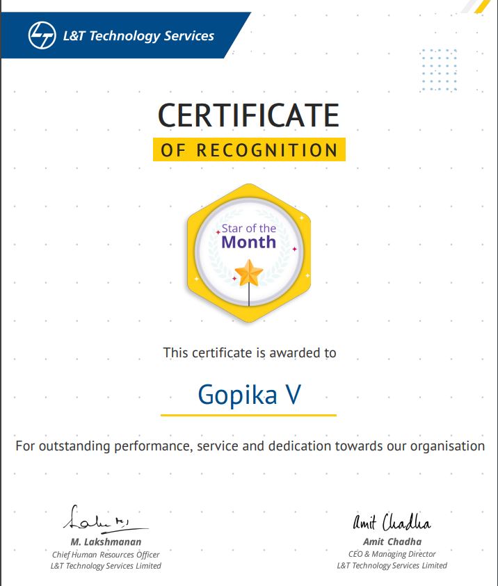 Awards Received star of the month award and customer satisfaction awards for the quality and timely deliverables